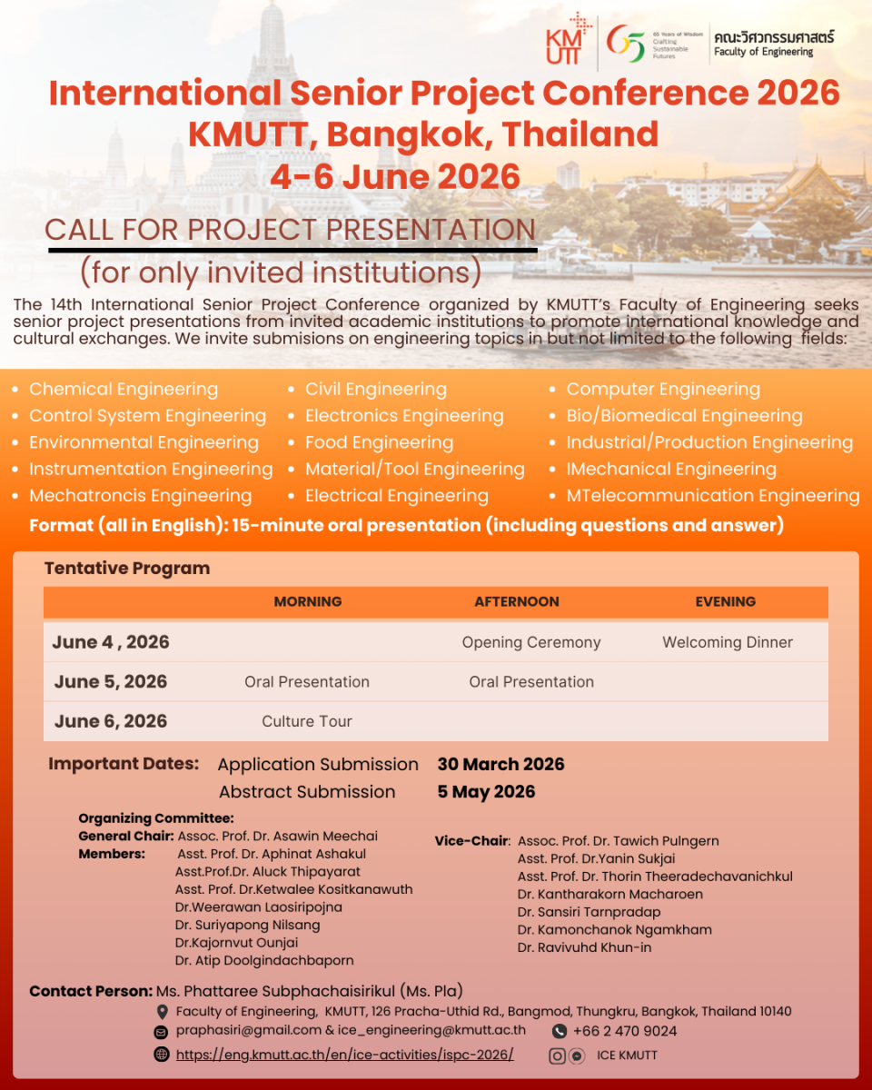 The 14th International Senior Project Conference in Engineering and Technology (ISPC 2026) is an annual academic forum that provides senior engineering students with an opportunity to present their projects, share research outcomes, and exchange ideas in an international setting. Through this conference, participants will enhance their professional knowledge, build international networks, and gain valuable cross-cultural experiences.